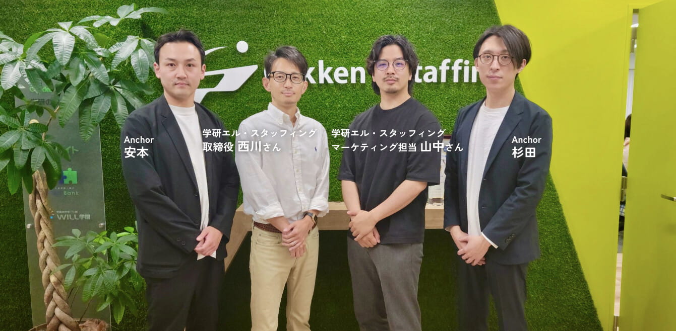 「アンカーさんは取引先を超えたビジネスパートナー」と、語るのは学研エル・スタッフィング取締役の西川さん。支援開始から約2年半、家庭教師事業におけるマーケティング支援にとどまらず、協業で新サービスの立ち上げにも携わらせていただいています。一体なぜ、ビジネスパートナーとしてアンカーを指名くださったのか。取締役の西川さん、マーケティング担当の山中さんにお話を伺いました。